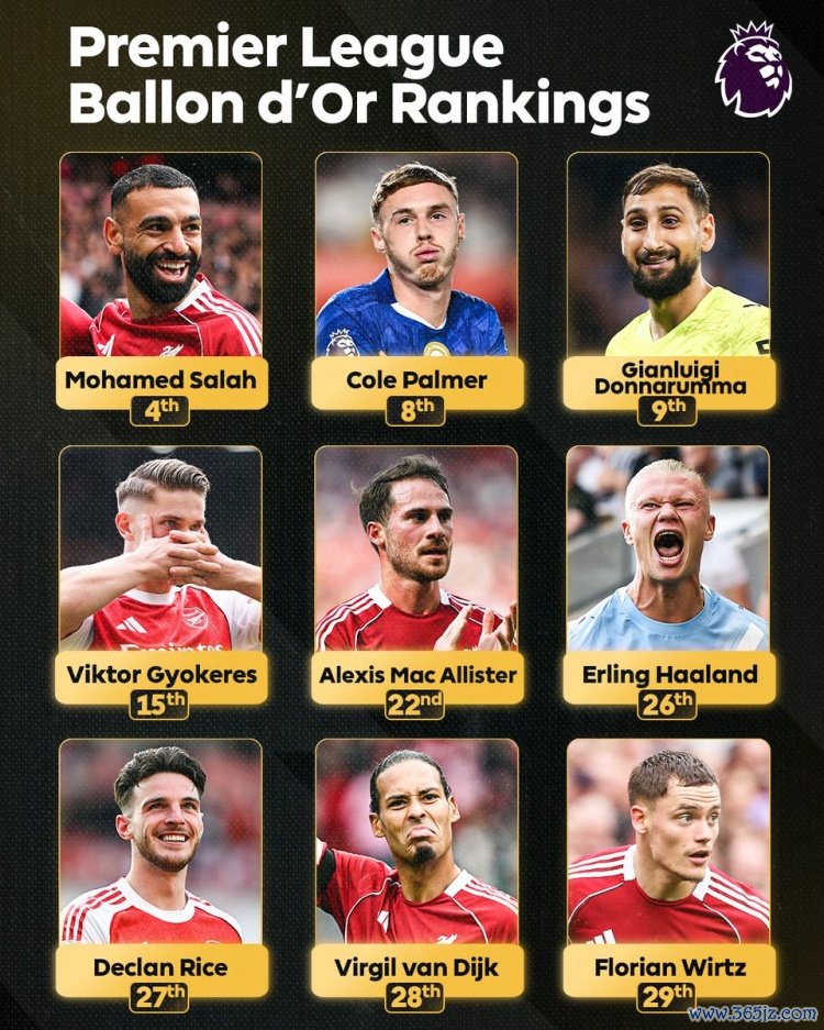 9月23日讯 2025年金球奖排名已经确定,前30中共9名目前在英超效力的球员, 台球资讯在线直播英超官方晒出这些球员以及具体排名, 马赛萨拉赫第4为英超球员最高。