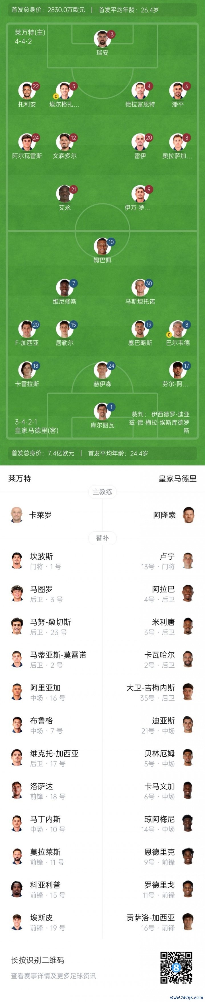 皇马杆位:1-库尔图瓦、17-阿森西奥、24-赫伊森、18-卡雷拉斯、20-弗兰-加西亚、8-巴尔韦德、19-塞巴略斯、15-居勒尔、30-马斯坦托诺、7-维尼修斯、10-姆巴佩