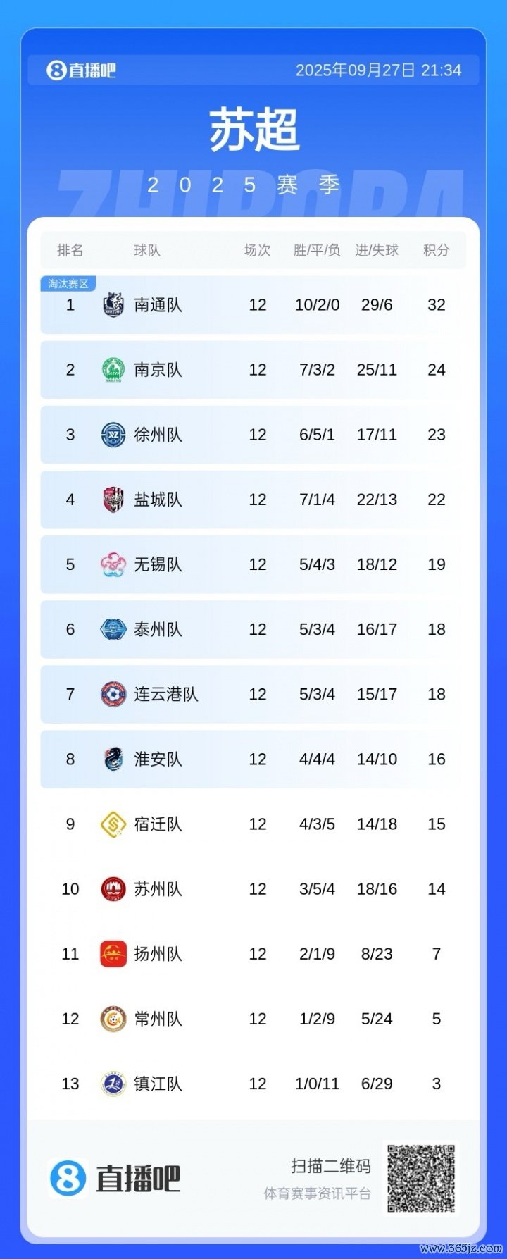 “苏超”常规赛结束!不败领头羊南通领衔8队晋级下一轮 ,常州第12收官