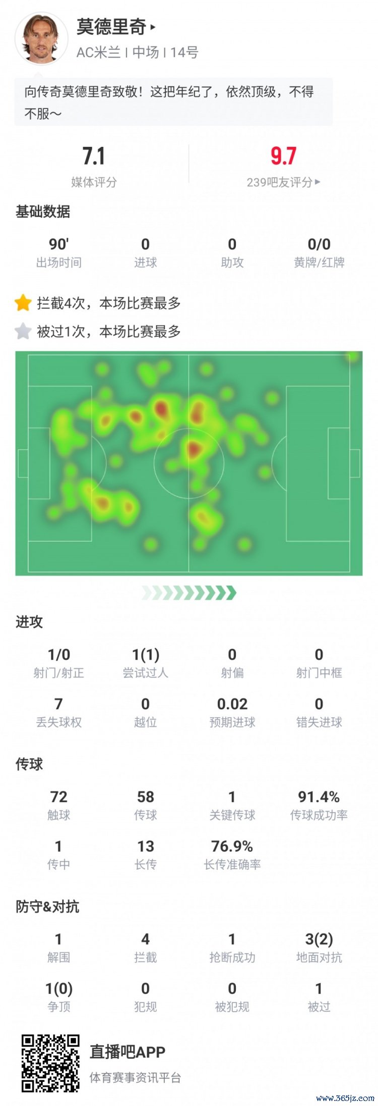 能攻能守!莫德里奇本场数据:传送球 成功率91.4%,4次阻拦 本场最多