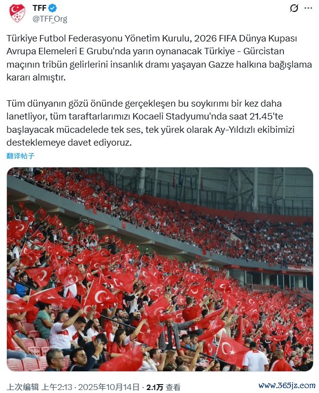 土耳其足协官方:将对阵格鲁吉亚的赛事 门票收入捐给加沙人民