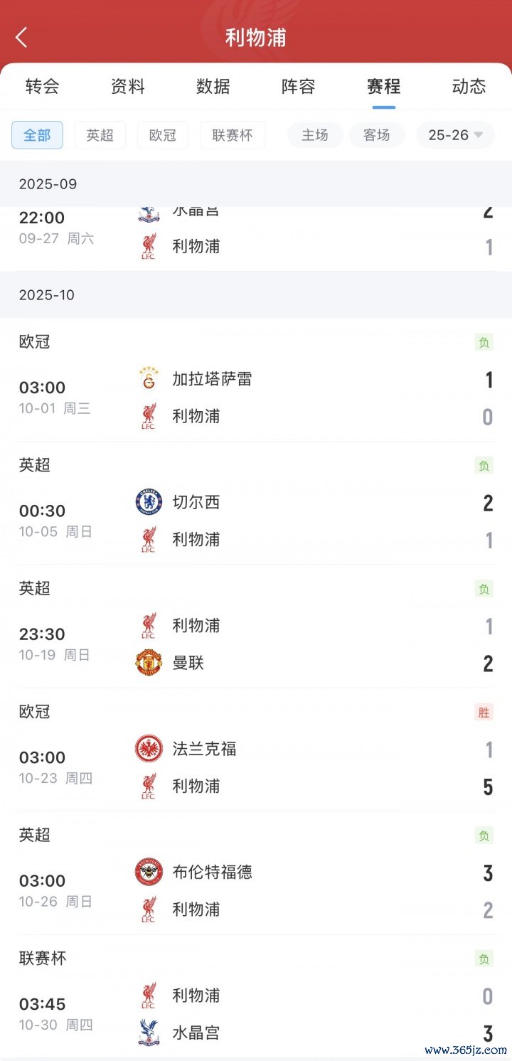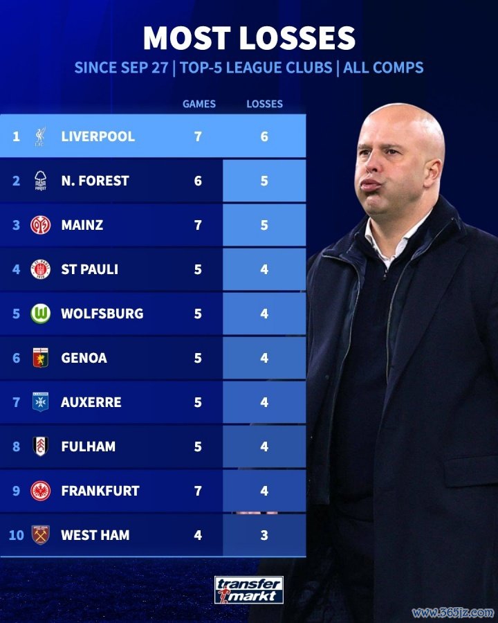 7战6负!9月27日以来五大职业联赛 输运动活动 场 次:利物浦6负排名第一