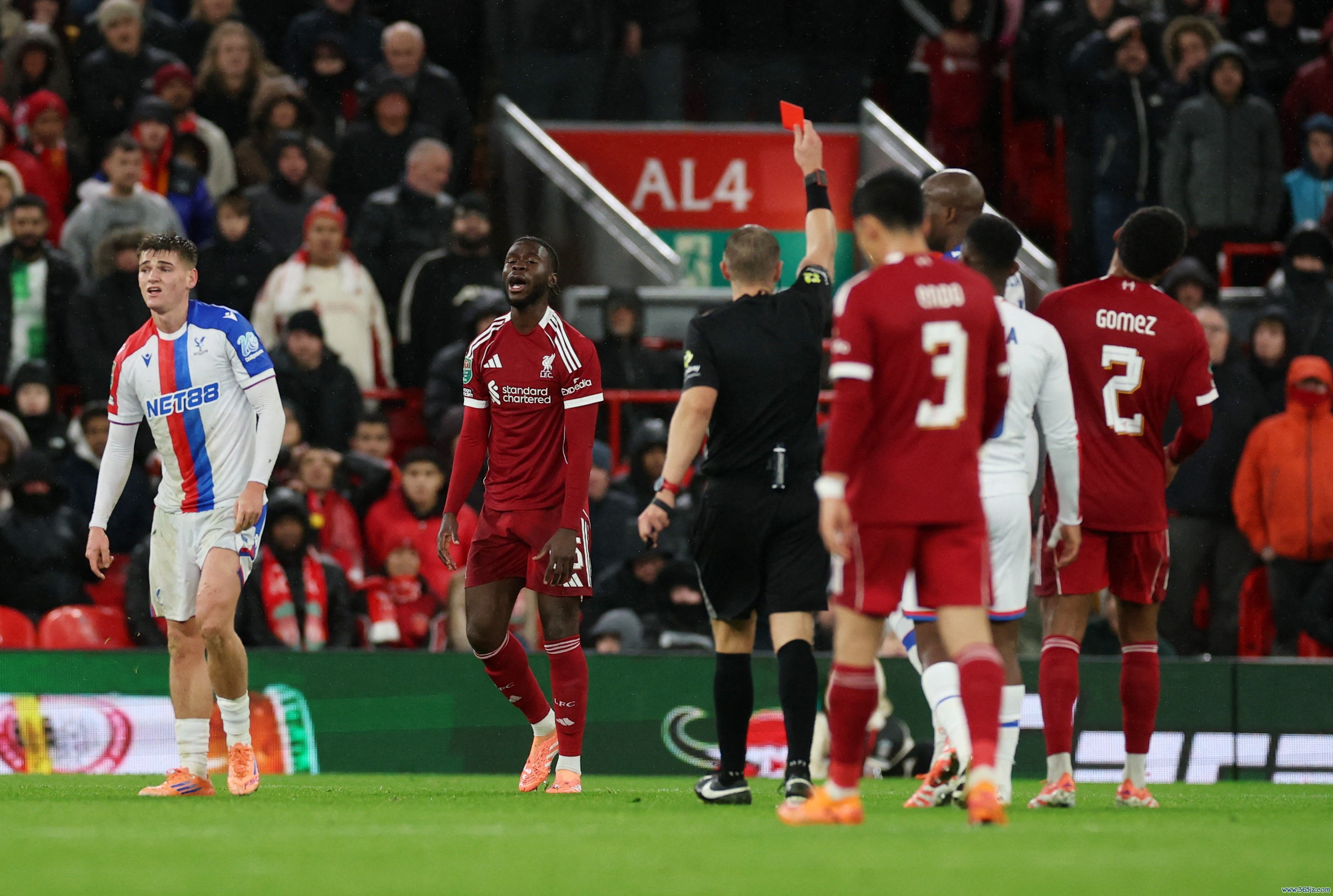 10月30日讯 利物浦在本轮职业联赛 杯0-3完败水晶宫,小将阿玛拉-纳洛一线队生涯第二次出场被罚下。