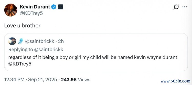 网友称孩子无论男女都会起名凯文-韦恩-杜兰特 KD:爱你我的兄弟