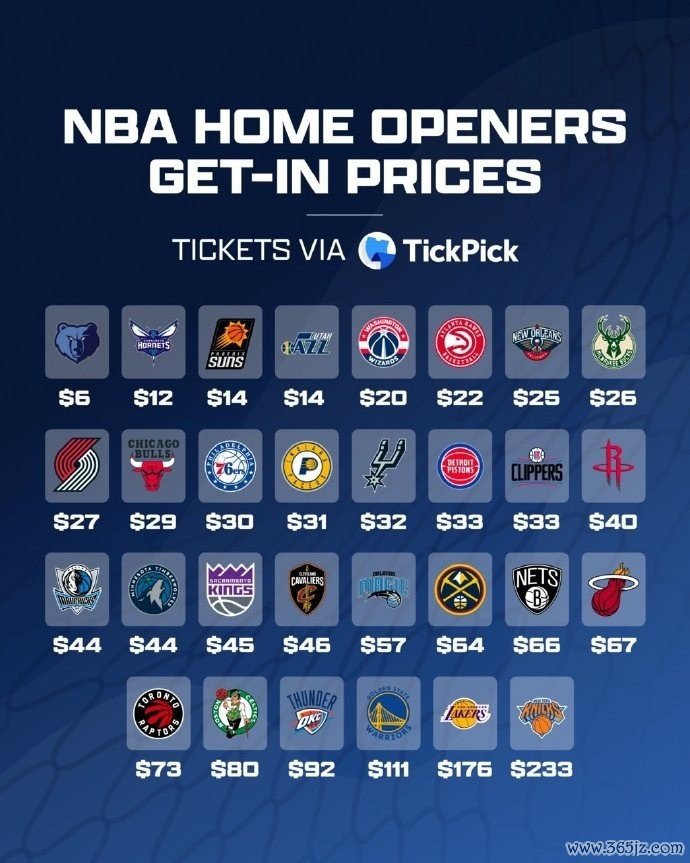 各队主场作战 揭幕战最低门票:灰熊仅6美刀 纽约最贵233$湖人176居次