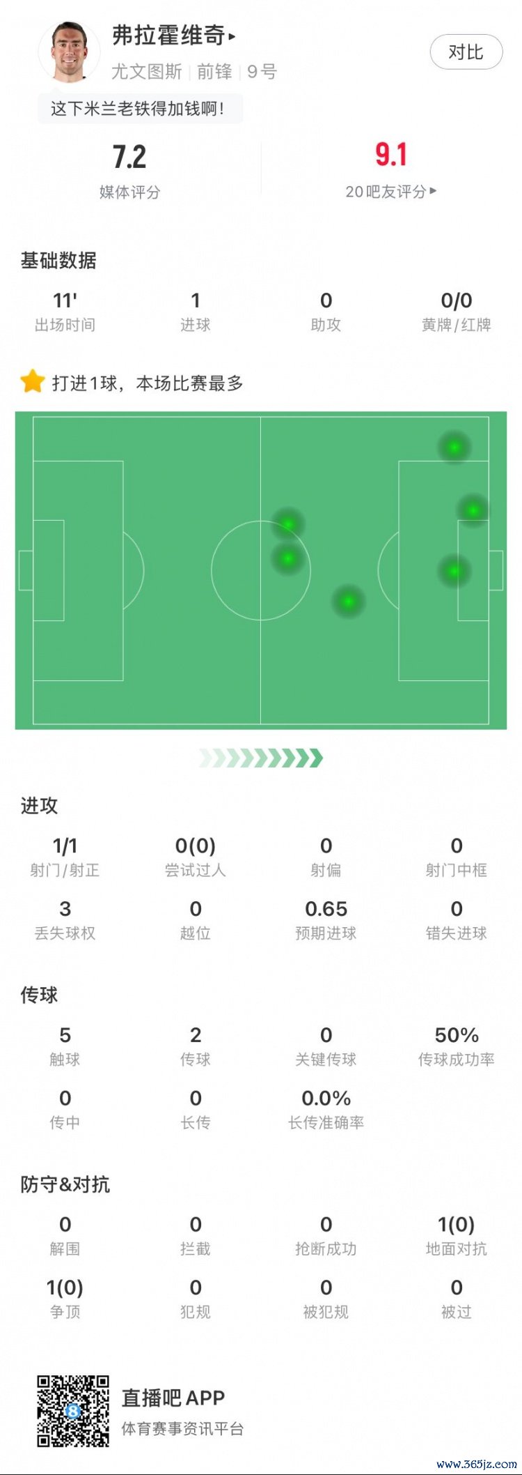 后备 锁定胜局!弗拉霍维奇全场数据:1得分 ,5次触球,获评7.0分