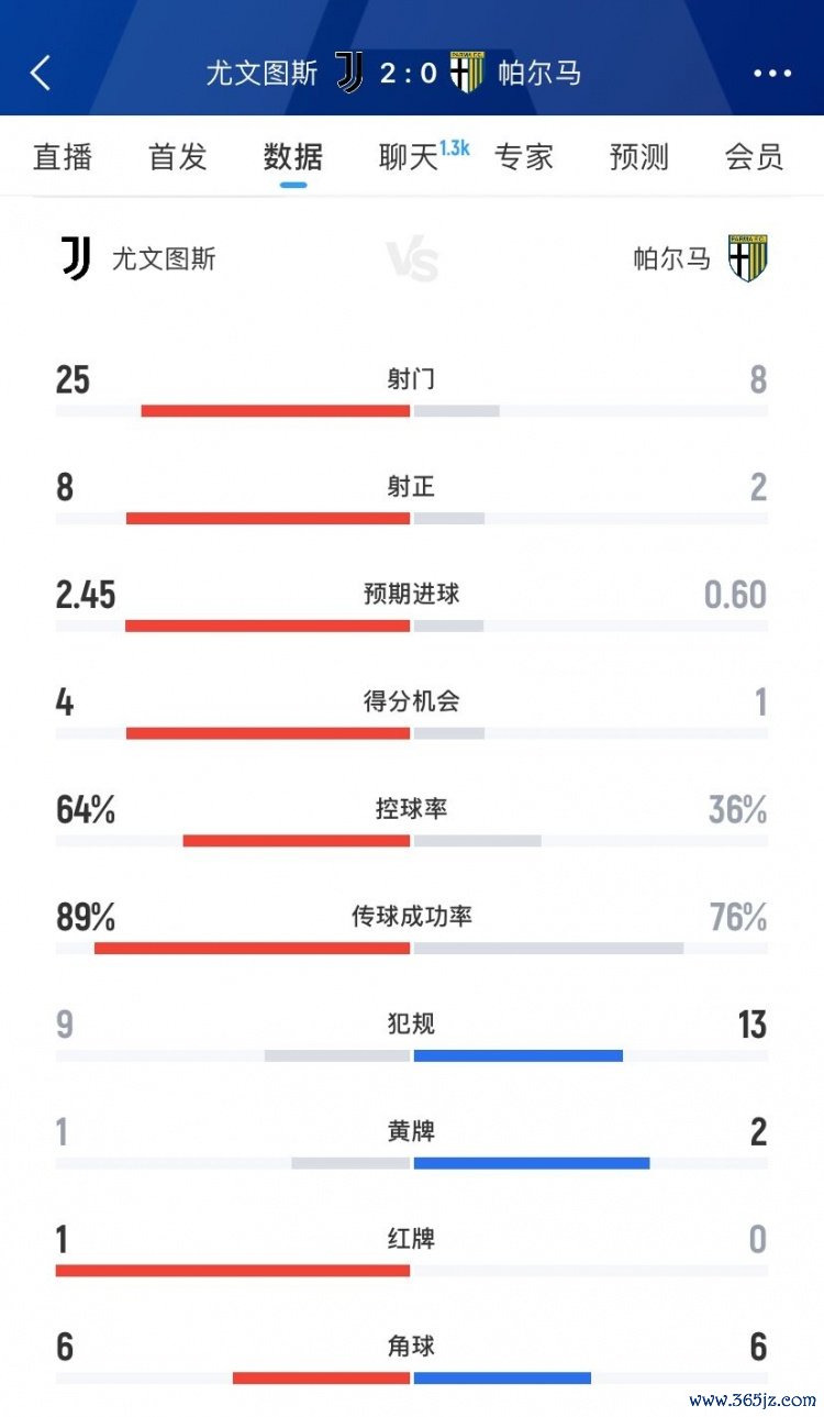 尤文图斯2-0帕尔马全场数据:射球 25-8、射正8-2、积分 机会4-1