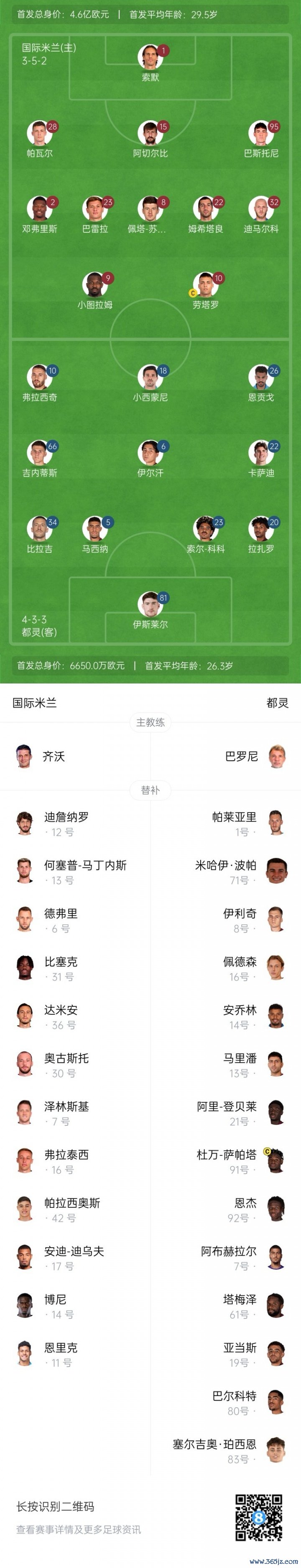 国米杆位:1-索默、28-帕瓦尔、15-阿切尔比、95-巴斯托尼、2-邓弗里斯、8-苏西奇、23-巴雷拉、22-姆希塔良、32-迪马尔科、10-劳塔罗、9-图拉姆
