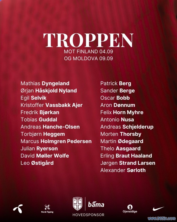 挪威国家队9月大名单:哈兰德、厄德高、鲍勃、索尔洛特在列