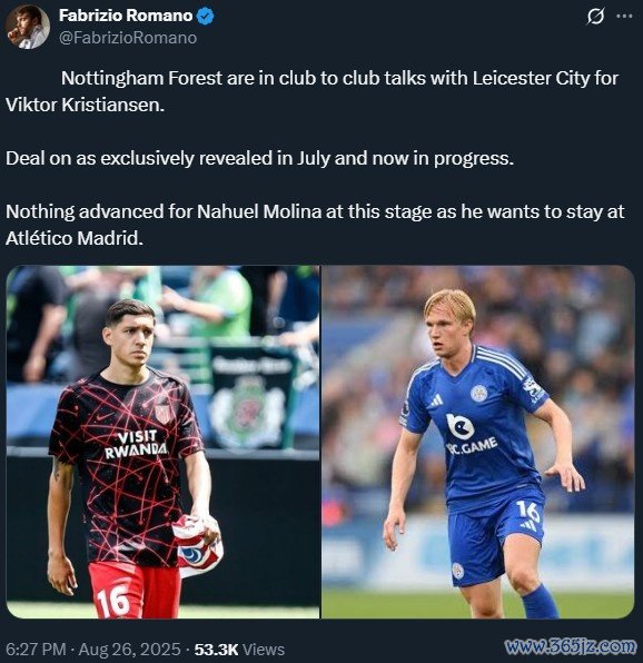 8月26日讯 名记罗马诺报道,诺丁汉森林在谈判莱斯特城后场球员克里斯蒂安森。