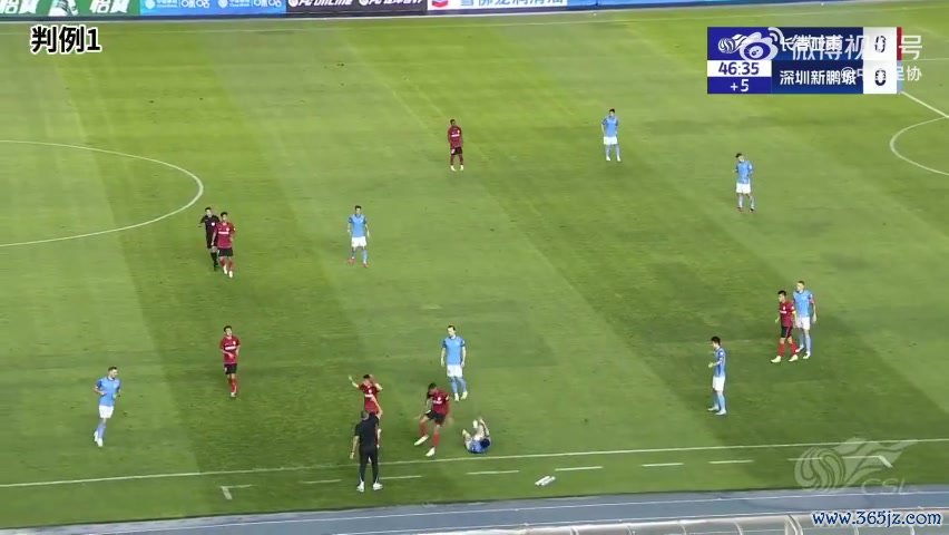 判例四:中超职业联赛 第22轮,长春亚泰VS深圳新鹏城。赛事 第90+6分钟,深圳新鹏城9号队员在对方罚球区内与长春亚泰4号队员争抢高空球发生接触后倒地,裁判 员未判决 违例 。VAR未介入。
