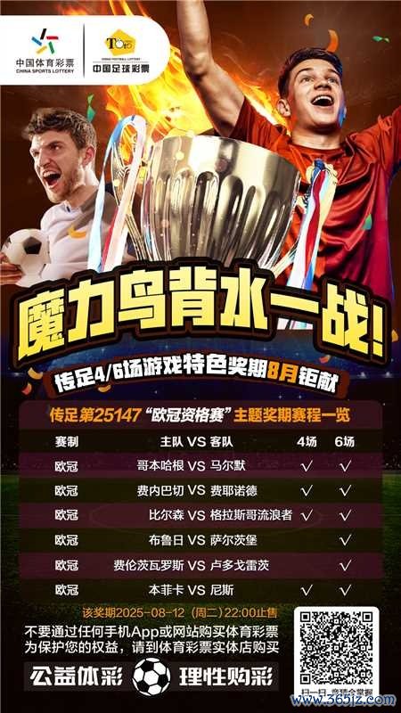 第25147期传足4/6场游戏特色奖期已经于2025年8月10日20:00开售,将于2025年8月12日22:00停售,并于8月13日开奖欧冠直播,其中哥本哈根VS马尔默、费内巴切VS费耶诺德、比尔森VS格拉斯哥流浪者和本菲卡VS尼斯为4场得分 游戏竞猜赛事。