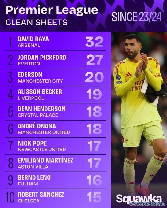 英超23/24赛季以来守门员零封榜:拉亚32场第一,皮克福德27场第二