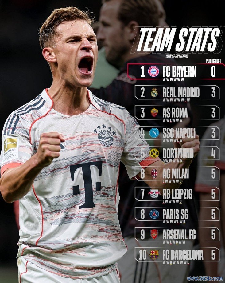 五大职业联赛 最少失分榜:拜仁全胜居首,皇马、罗马、那不勒斯失3分