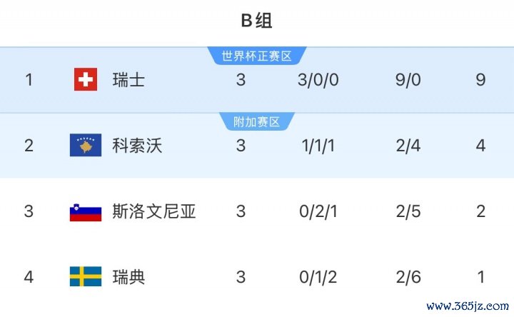 B组瑞典世预赛两连败且三场不胜, 马赛仅积1分暂垫底。瑞士三连胜领跑。