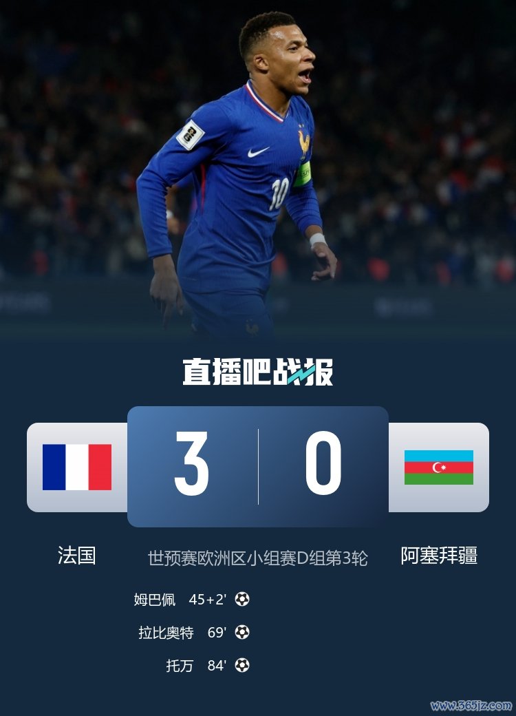 世预赛欧洲区小组赛D组第3轮,法国3-0轻取阿塞拜疆,姆巴佩传射、拉比奥特、托万得分 。
