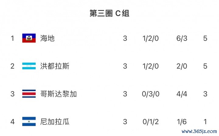 目前在该小组,海地和洪都拉斯3轮5分分居前二,哥斯达黎加3战3分第三, 马赛尼加拉瓜3战1分垫底。